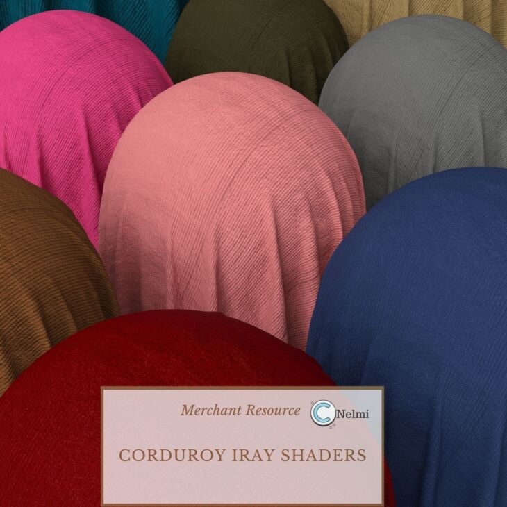 Corduroy is a textile composed of twisted fibres that, when woven, lie parallel to one another to form the cloth's distinct pattern, a "cord." This set of 30 Corduroy shaders for Iray, in fashionable colours, are sure to meet your needs.