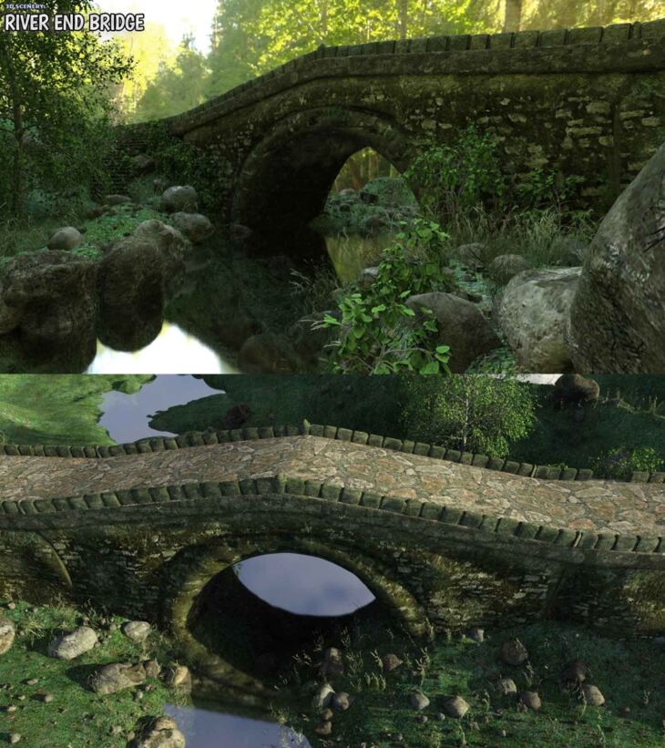 They are fairly high in polygons to retain geometric detail, so keep this in mind. Aside from the basic scene and a preload, it also contains extras, such as flowers, extra bushes, rocks and a tree you can place yourself to add details to the scene. The textures are high in detail, and up to 8K for the large bridge parts.