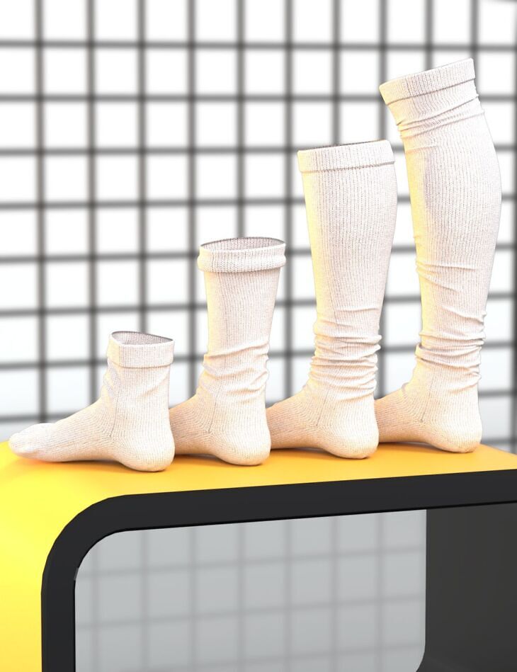 Lots O' Socks comes with four unique styles: Ankle, Crew, Calf, and Knee High. Thanks to Daz's Auto Follow functionality, these socks will seamlessly fit any figure, including custom morphs.
