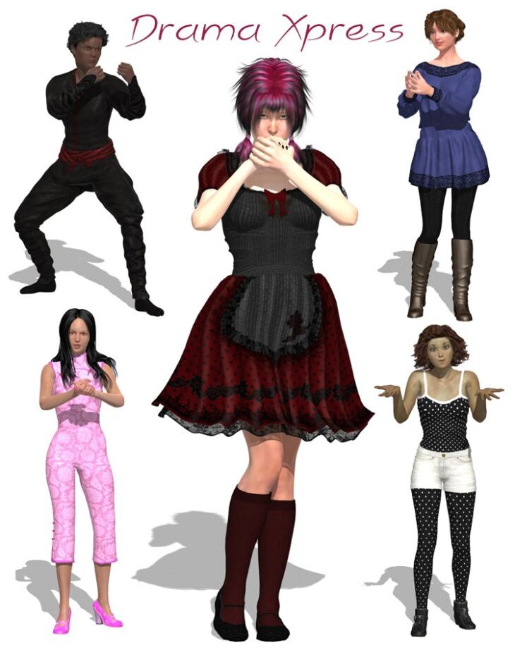 3Drama Xpress is a modular pose set consisting of 30 full body poses, 30 matching expressions and 30 partial leg poses of specific emotional scenarios. Along with the 10 utility poses, there are a total of 100 3D animation software poses altogether.