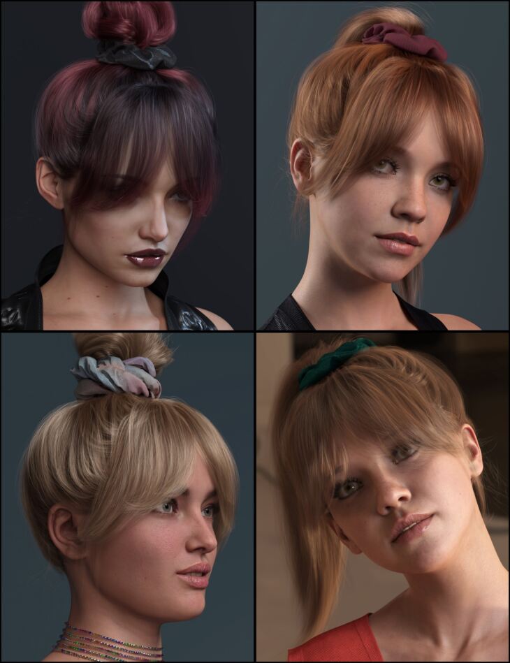 Choose your style with this high-quality, realistic high updo with three different bun models and a ponytail to choose from. The bangs come with multiple style options to match the mood you want your Genesis 8 and Genesis 8.1 Females to render in.