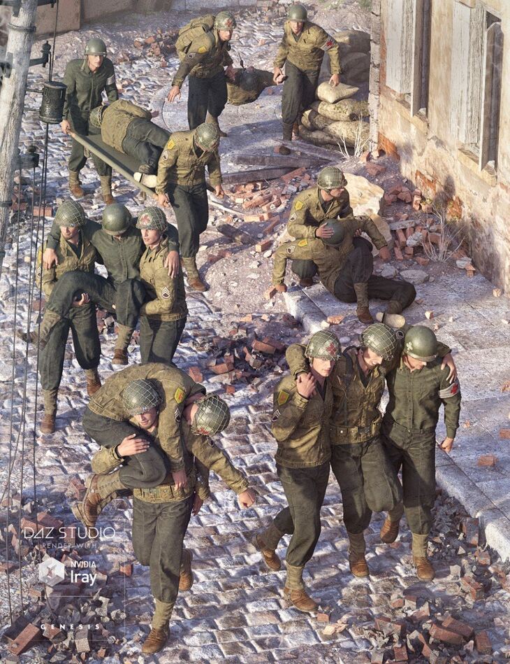 A set of 20 highly detailed and well crafted poses for the Genesis 3 Male & Genesis 8 Male that give a number of scenerios for helping a comrade or victim in need.