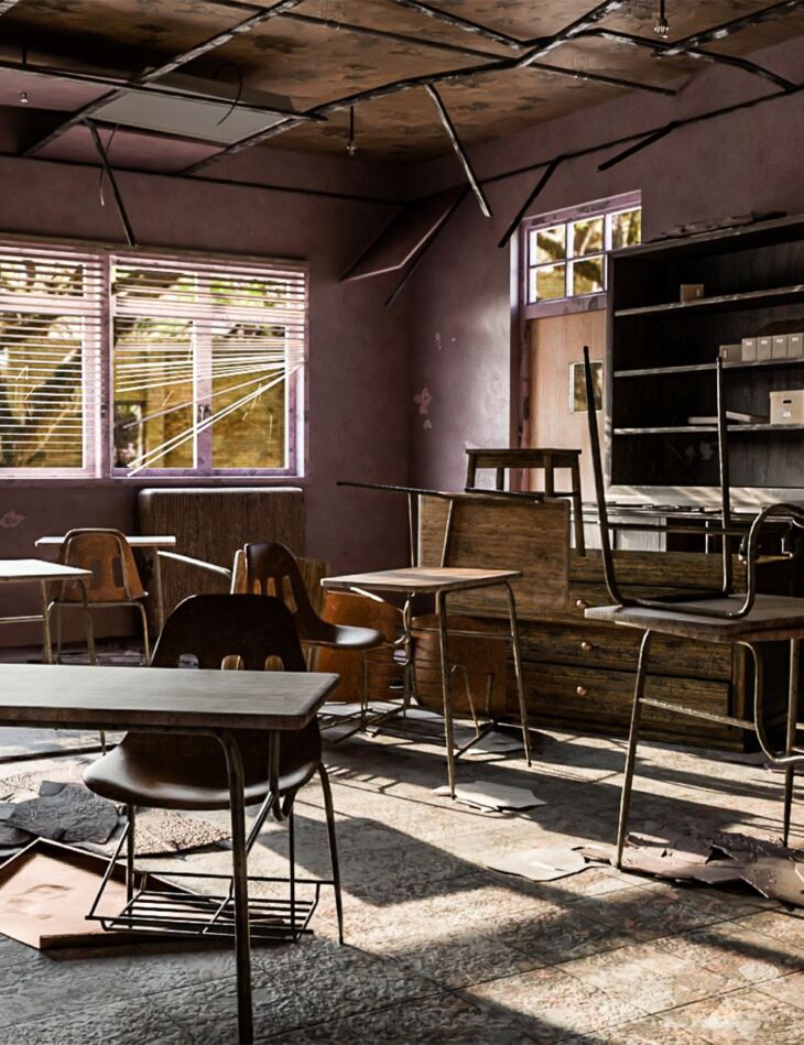 The Abandoned Academy is an environment lost to time and neglect. This set includes broken chairs, cabinets, armchairs, and tables that create a realistic, abandoned scene.