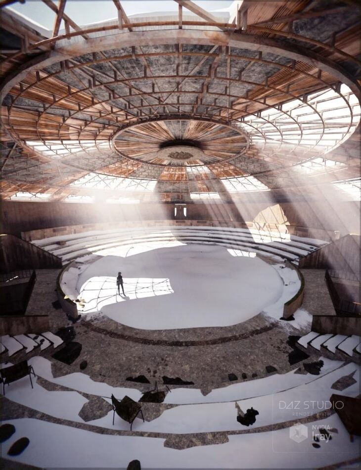 A complete ruined building environment, both inside and out, with a ruined reception area downstairs and amphitheatre upstairs.
