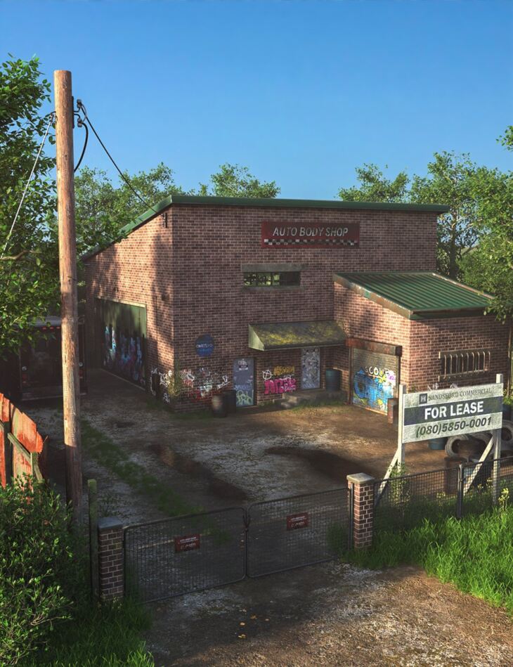 This set includes a building with moveable doors and parts, plants, grasses, trees, bushes, oil drum, discarded tyres and a realtor sign. There are 4 render presets and 6 camera presets.