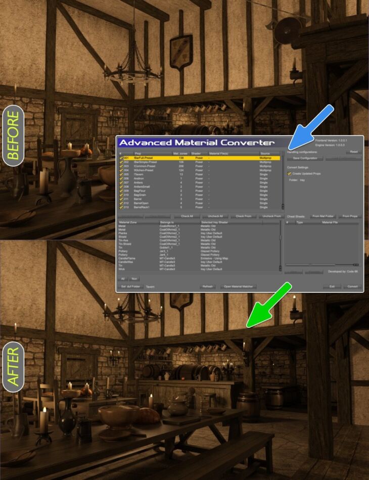 Do you have a large collection of older props and environments that lack Iray materials or you have grown tired of having to convert the materials every time you load those things into your scene? Are you hesitating to purchase props and environments that don't come with Iray materials because it's difficult to convert them so they render great in the Iray render engine? Wait no more, Advanced Material Converter is here to help you.