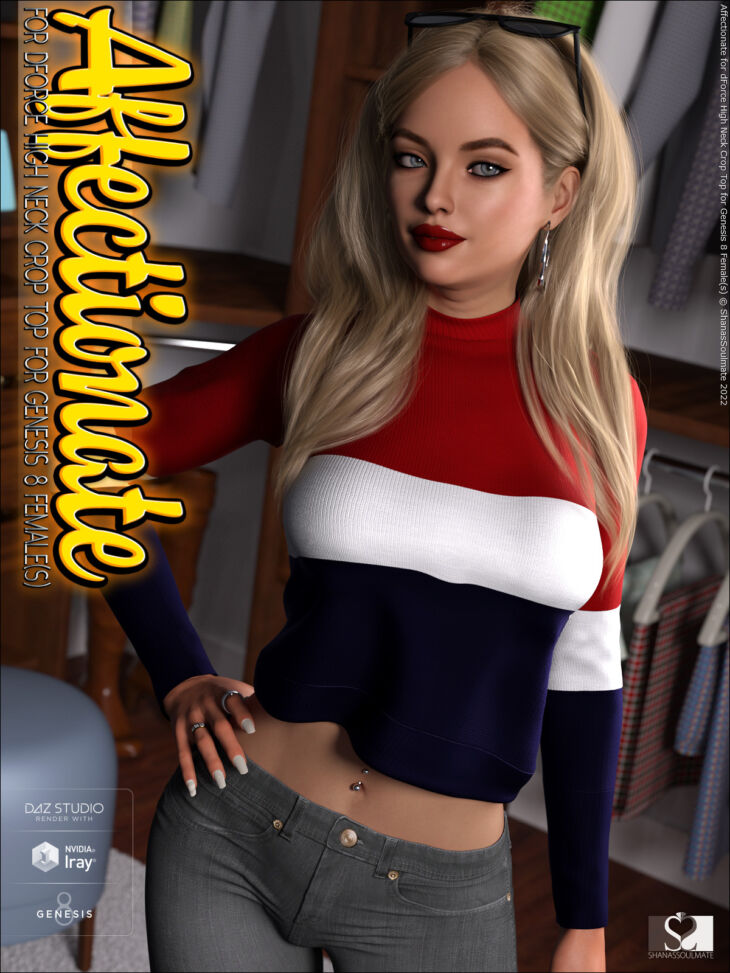 Affectionate is a brand new texture pack for Sveva's dForce High Neck Crop Top for Genesis 8 Female(s), with this pack you'll get 12 new fully detailed high-resolution texture styles.