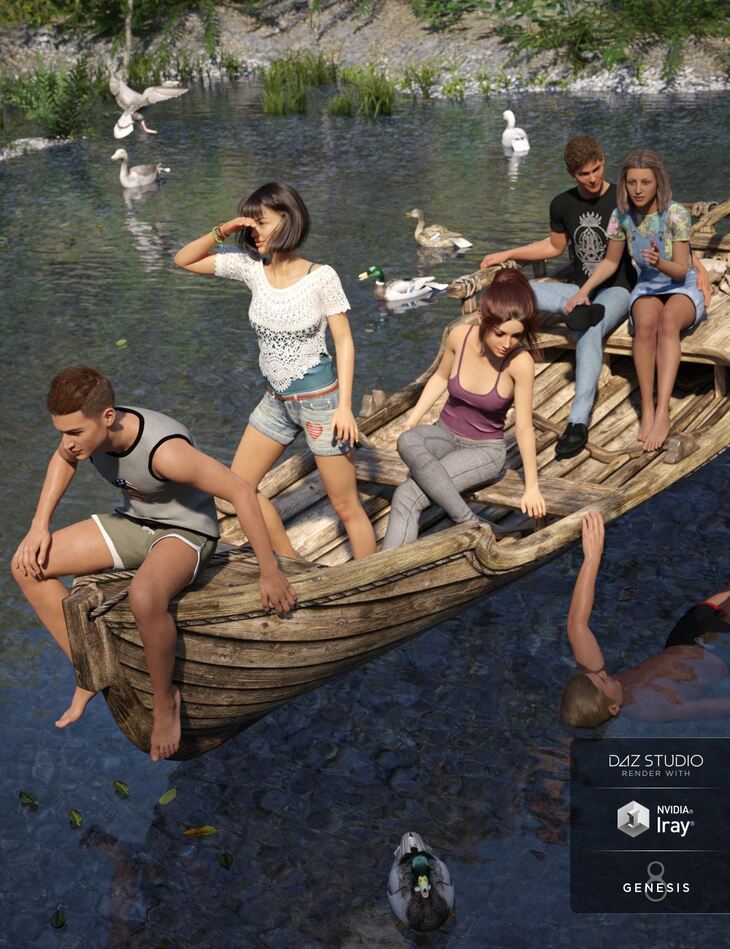 A warm summer sky, an old rickety rowboat, and a couple in love. Pieces of a perfect romantic episode, ready for you to paint in your renders.
