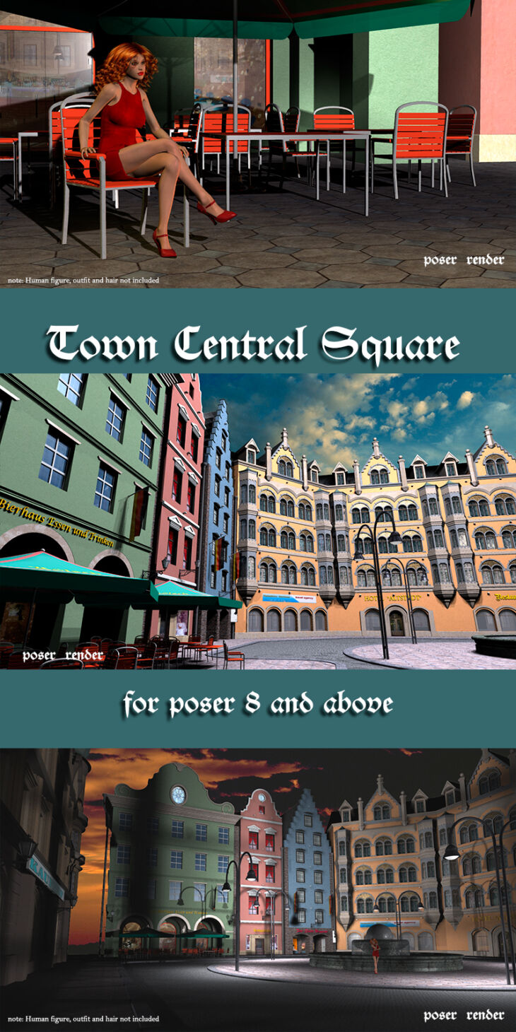 This package is the typical small German town central square. Package contains 11 props, 2 light and 2 camera presets. Product includes the following props: 5 different buildings, 1 additional props - additional walls for buildings, yard, water props for fountain, grouped chairs and tables for Beerhaus, single chair and single table.
