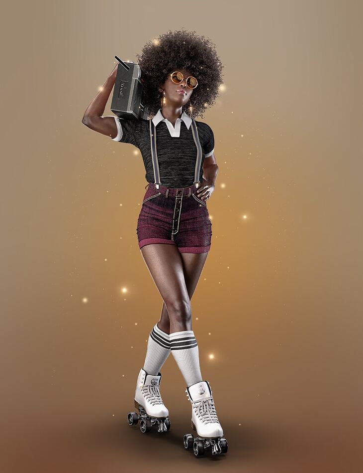 The style of the charming rollergirls of the 70s has finally arrived. With AJC Boogie Rollergirl Outfit and Boombox for Genesis 8 and 8.1 Females, you will have what you need to customize your retro girl. This set has a complete outfit with a jacket, shirt, shorts, socks, glasses, suspenders, and roller skates. Of course, there's also a stylish boombox so you can hear your favorite songs!
