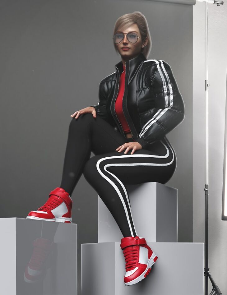 The outfit consists of a beautiful jacket, leggings, a top, and sneakers.