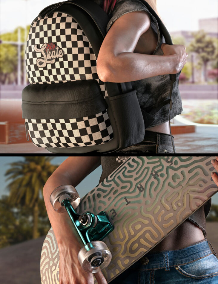 Get your characters looking shred-ready with AJC Pro Skate Poses and Props for Genesis 8 and 8.1 Females. This set includes a customizable skateboard, backpack, and several poses for female skaters.