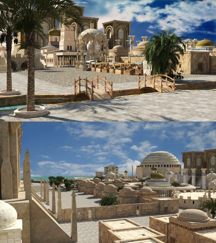 It is good for both close and distant renders. All the buildings, walls, stalls, arches, and trees are instanced so that you can rearrange and duplicate the objects as you wish.