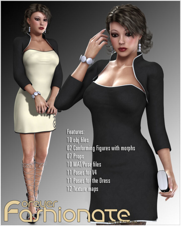 Forever Fashionate is a new outfit for Victoria4, consists of a conforming dress, bolero with different morphs and 7 props. Included are many styles and poses for your Victoria4!