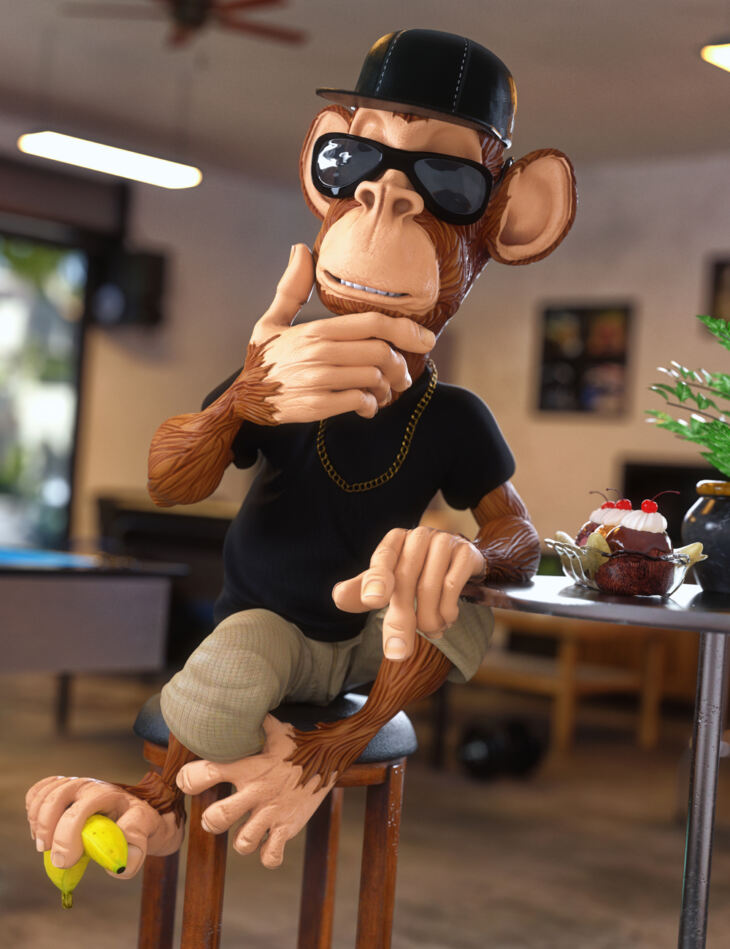 The package includes the Alfred the Toon Monkey shape with rigging adjustments and HD detailing, texturing, and 5 clothing items developed specifically for the character (hat, glasses, chain necklace, shirt, and pants) with corresponding textures.