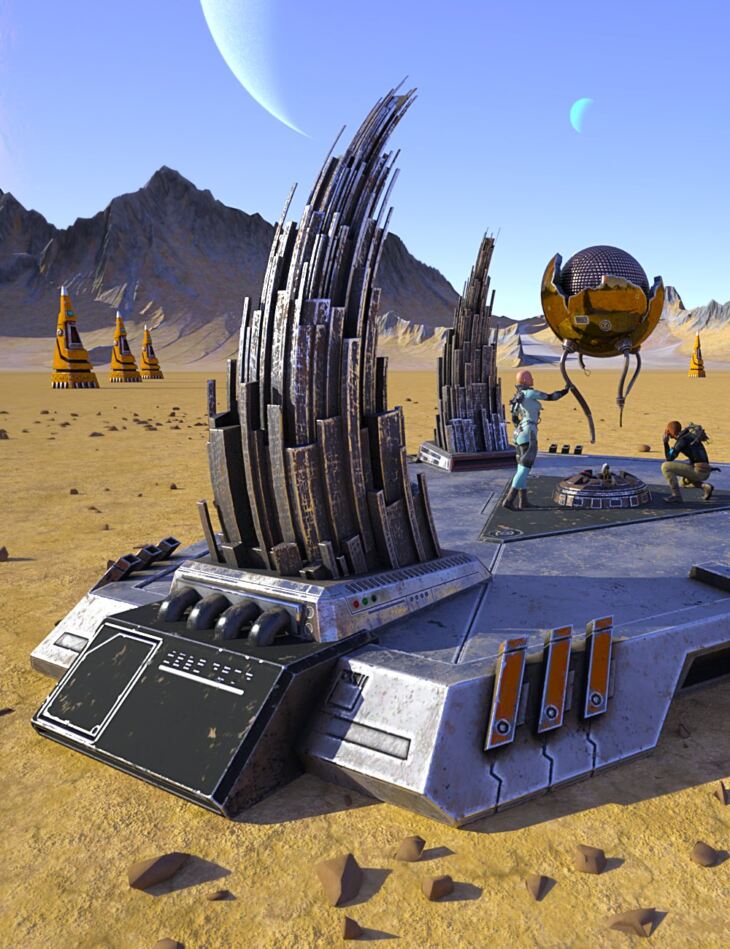 Remnants of ancient technology, left behind by a long-vanished civilization. Mysterious and edgy props for sci-fi, post-apocalytic and space fantasy scenes.