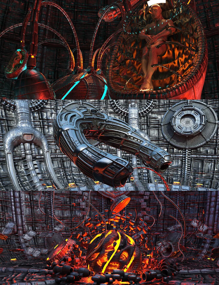 There are morphing Face and Priest Statues, CryoPods with clones, sci-fi sphere with electronic screen, rails, rings, vents, morphing floor, and much more. Indoor and Outdoor scenes and 2 with an explosion effect. A very highly details Spaceship. See the walk-through for more details.