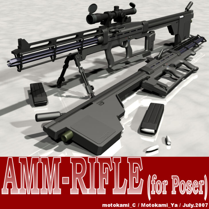 "AMM(ANTI-MECHANICAL-MONSTER)-RIFLE" is science-fiction Rifle. Specification of "AMM RIFLE" >Caliber:.60 (15.24mm) / caseless-steel-penetrator ( Gunpowder is not used ) >primary acceleration: Compression air >finally acceleration: Electromagnetic field( principle like linear-motor ) >power source: Fuel cell This rifle is designed by "motokami_C".