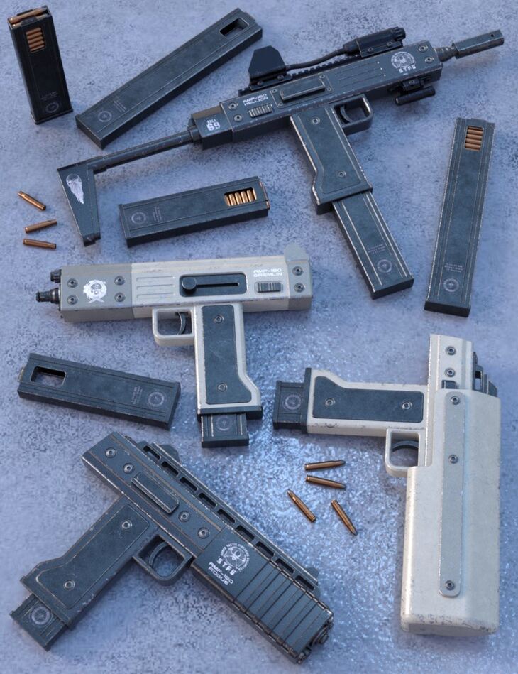 The AMP-180 Assault Machine Pistol comes in three versions - Hellion, Gremlin and Rogue - along with two magazines, a holster for the Rogue, a pose-able casing string, cartridge, casing and a muzzle flash prop for each gun.