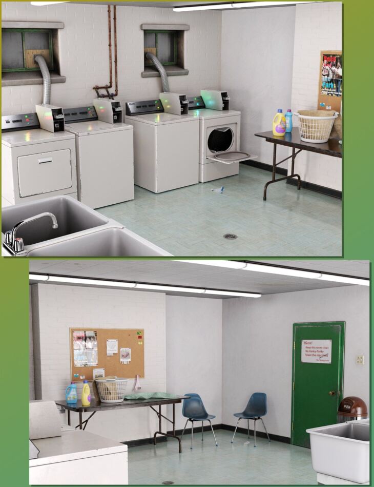 The 'Apartment Laundry Room' is the sort of room that you would find in the basement of an older tenement building. This large set contains everything you need to set up a scene for rendering. It contains a room, props, and poses for Genesis 8 figures. All you need to add is your own characters.