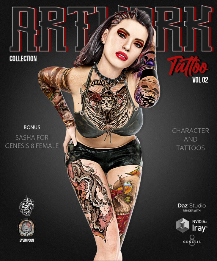 Artwork Tattoo Collection Vol 02 is a collection of tattoos and skin art that can be applied to any female Genesis 8 character.