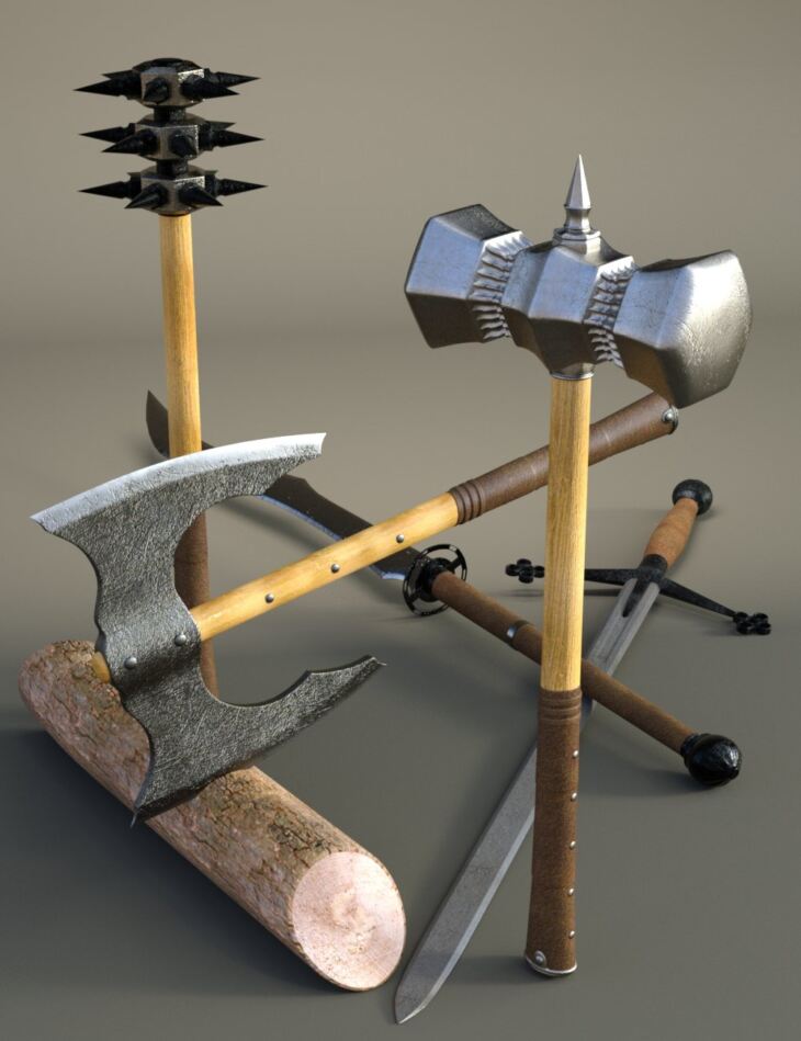 A set of 5 weapons for The Brute 8 - a sword, an axe, a cudgel, a Japanese sword, and a war hammer. Also has hierarchical Hand poses for each hand for each weapon.