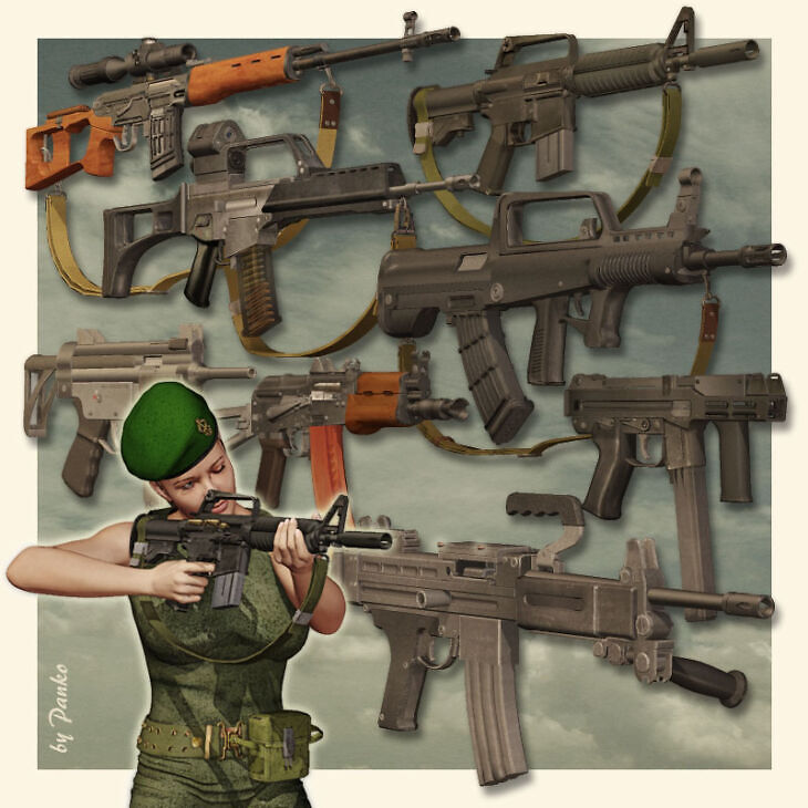 This is a set of eight modern fully poseable military assault weapons intended to work with DAZ's Michael 3 and Victoria 4, however it can be used with any other character with a little tweaking of the pose dials.