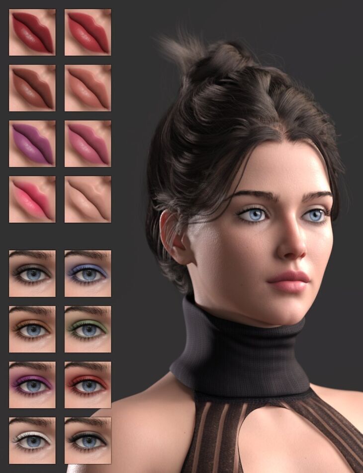 Giselle or Genesis 9 includes face and body shape, head and body HD details, PBR materials, 8 L.I.E. lip colors, 10 L.I.E. makeup options, eye color, fibermesh eyebrows, and normal maps.