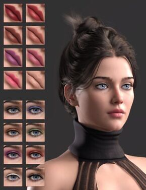 Marielle for Genesis 9 includes face and body shape, head and body HD details, PBR materials, 8 L.I.E. lip colors, 10 L.I.E. makeup options, eye color, fibermesh eyebrows, and normal maps.