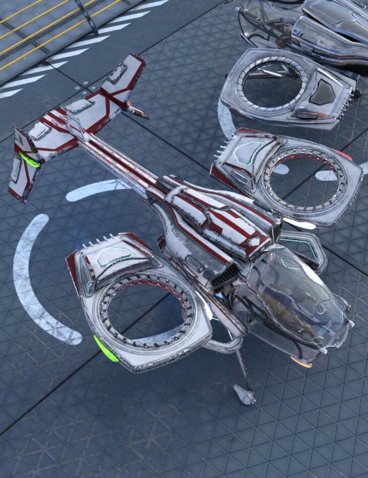Featuring a twin bladeless-fan lift engine setup, this particular aircraft offers a striking silhouette. Fully articulated, this craft is ideally suited for getting into, and out of, tight spaces.