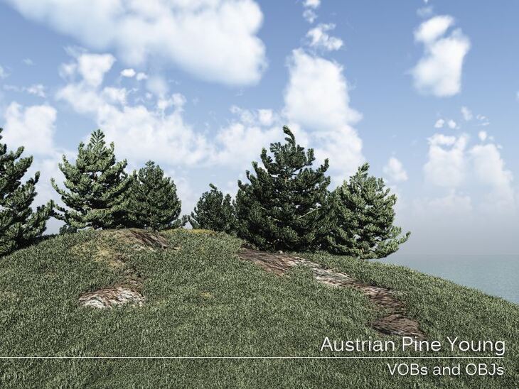 Vobs for Vue, and OBJs for any app that can import object files, a set of 3 young Austrian pine trees. Well suited to the adult trees also available.