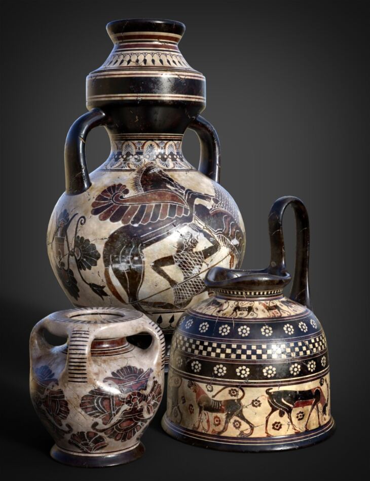 B.E.T.T.Y. Archaic Pottery 03 is a set of 14 Archaic Vases Props with a uniquely historic look that will add realism to museum scenes, art galleries, and archaeological sites.