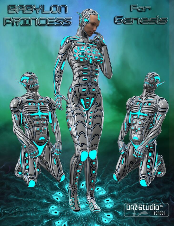 Babylon Princess is the latest Sci-Fi outfit from Midnight stories. This is the Genesis version, which supports Victoria 5, Victoria 4, Stephanie 5, Aiko 5 and Genesis 3D model Female shapes. It comes with latex glow and worn metal materials. It also has DSON support for Poser.