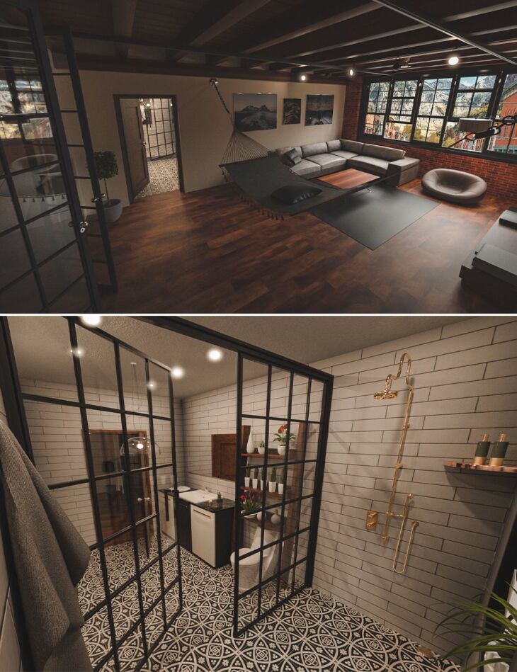 Bachelor's Hammock comes with an industrial design, a full set of furniture and an awesome hammock for your characters to recline in the center of the space. This indoor environment also comes equipped with a bathroom that's full of plants which makes the place lively.