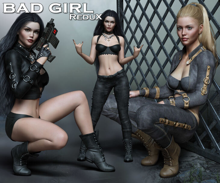 Bad Girl ReduX is a clothing pack originally done for Genesis 2, and it’s been revitalized for Genesis 3, and Iray. The jacket and pants are very much the same with some morphs and texture improvements, but the top and boots are completely new!