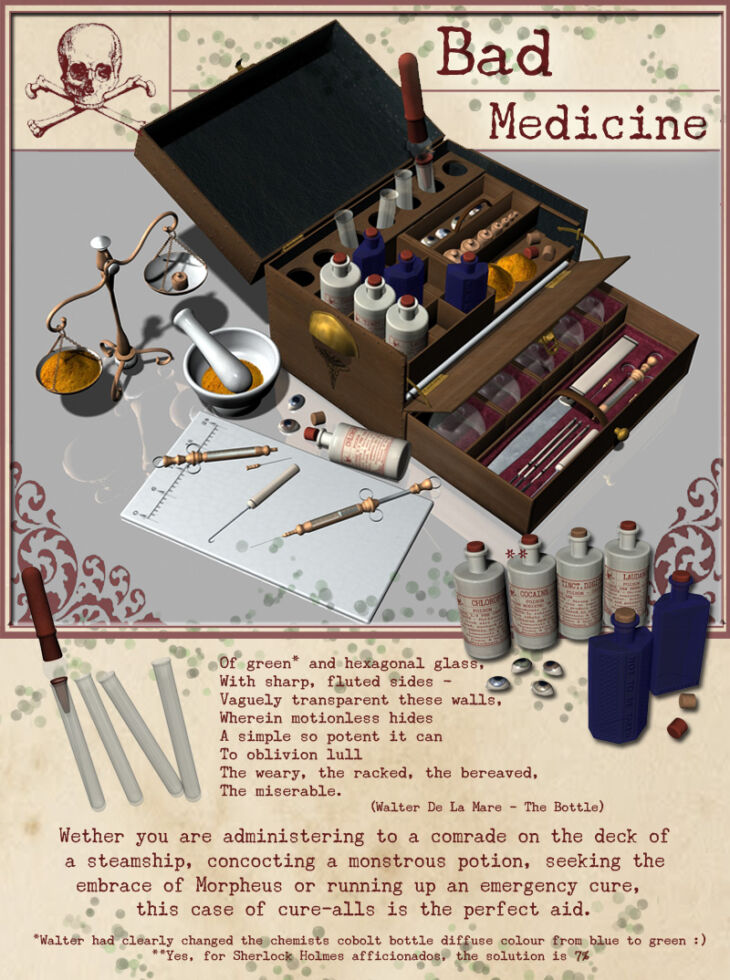 Yes indeed, there's nothing worse than being caught in the middle of an airship-battle with an under-equipped medic! Based on Victorian reference material, this medical box contains a goodly amount of items for chemist, doctor, mad scientist or the experimentally inclined.