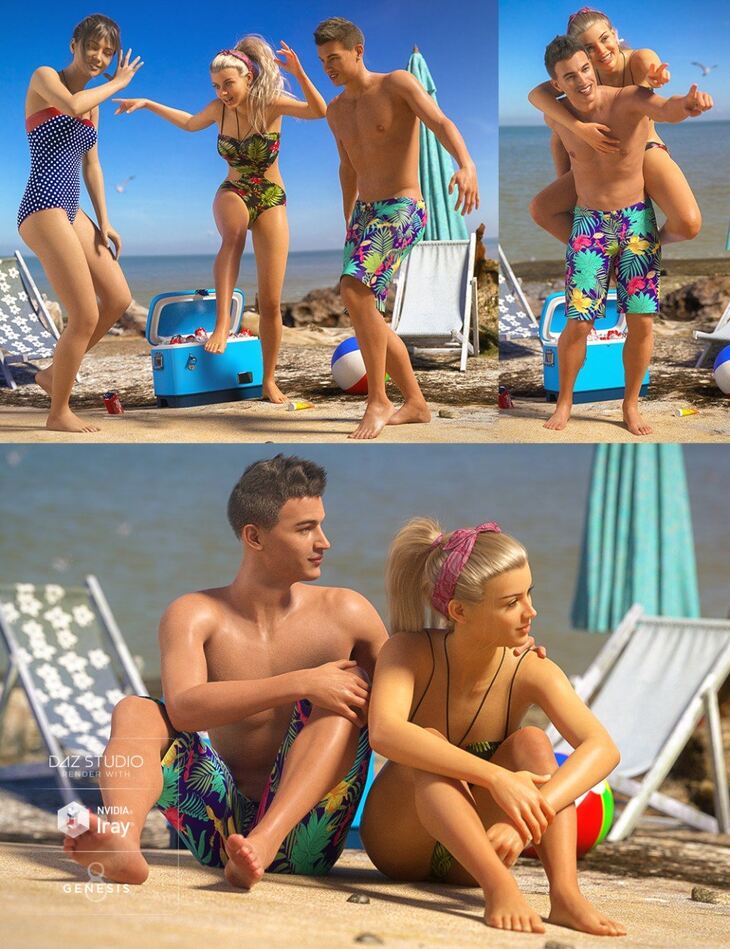 Included in the set are two single stance poses, four two-person vignette poses, and two three-person vignette poses for both Genesis 8 Male and Female that have them playing in the surf, to sitting and chatting with friends in the sand, to cavorting and having a good time in your renders.