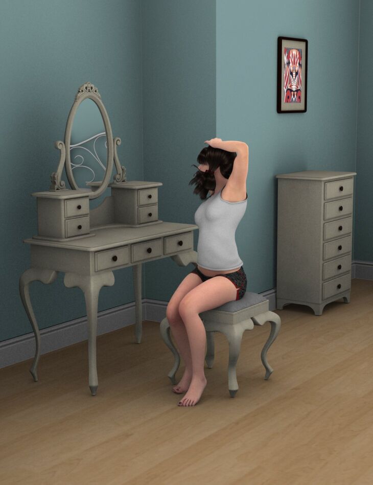 Furniture props for a bedroom. Dresser table, Bed, Bedside Nightstands and Tallboy.