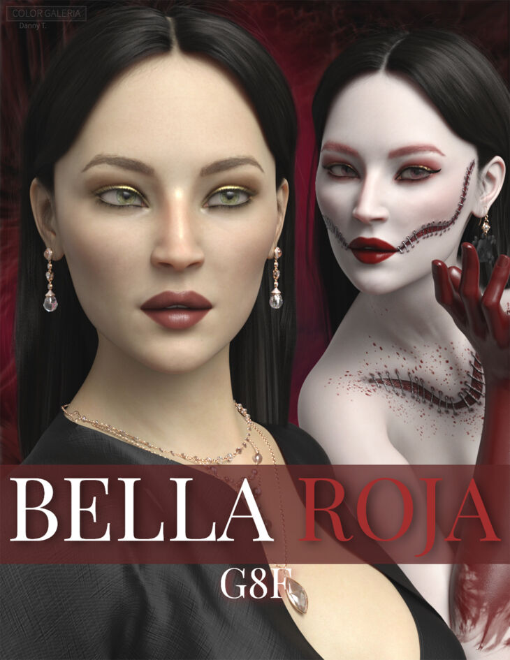 Bella Roja is a beautiful and unique character for Genesis 8 Female, with natural skin, daily makeup and horror wounded skin. She is a custom morph sculpted using the base Genesis 8 Female figure.