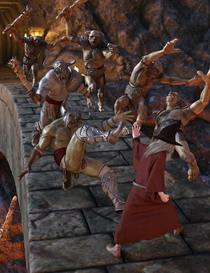 A set of 20 poses for Genesis 8 Male for use with the Beneath Fire Mountain scene.