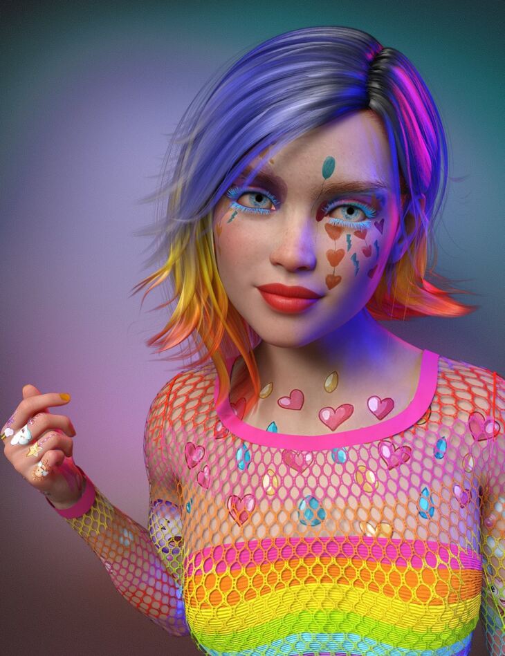 Berkley Teen is a custom character for Genesis 8.1 Female with realistic textures and complete with eye colors, lip colors, nail colors, tattoos, and makeup options to change up her look.