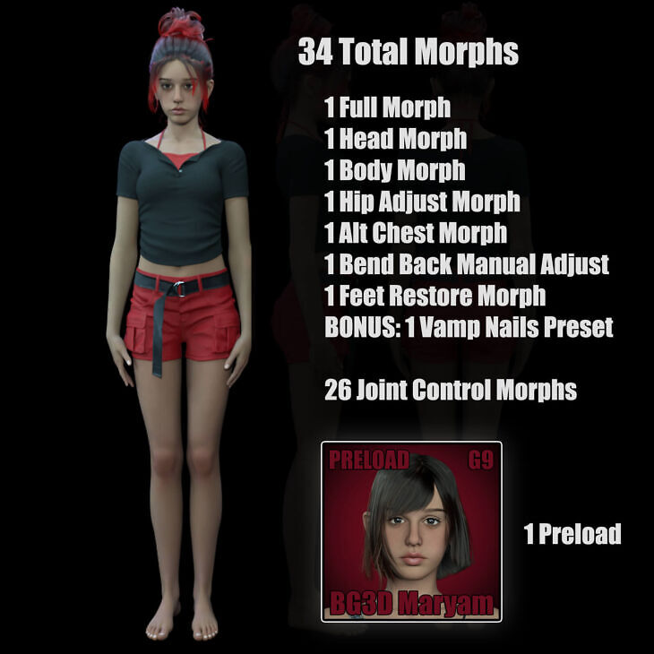 Maryam with Bonus Halloween Materials are now available for the Genesis 9 Figure. Maryam comes with a separate BONUS Vampire Skin Set, Special "End of Summer Tanlines for the feet and specific morphs.