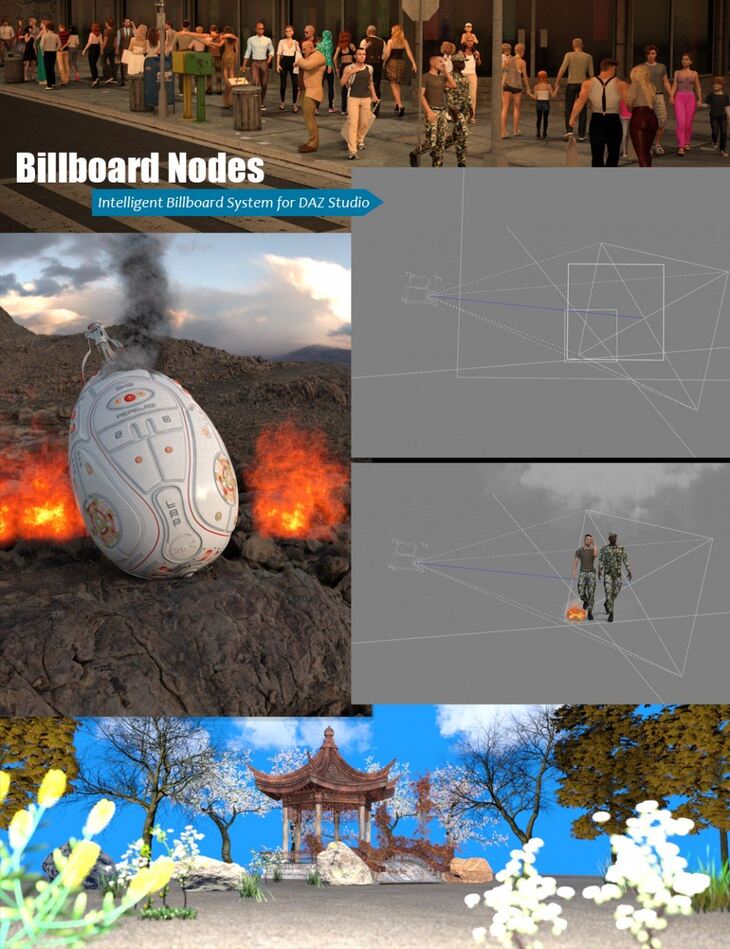 Billboard Nodes is a plugin for Daz Studio that creates flat planes that always align to the user. Works automatically with all cameras and views in the viewport.