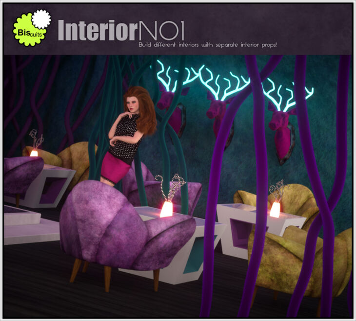 It contains: 20 Fill Props; lamps, chairs, curtains, pillows, cushions, decosheads, decodeer, decobowl, roomdivider and a sidetable.