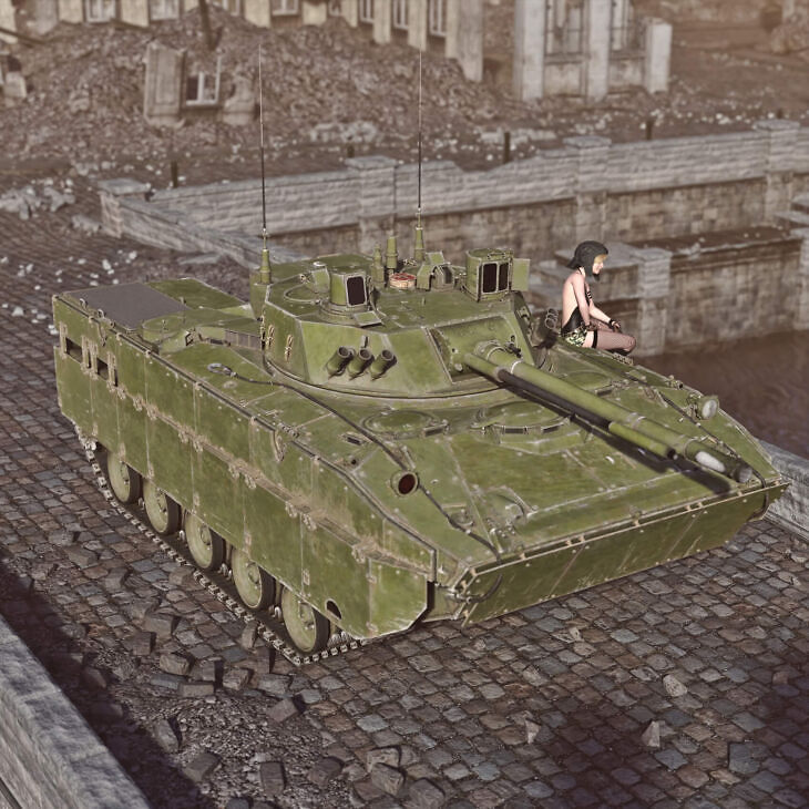 Turret hatches are also rigged. Good for transportation and for combat with lightly armored enemies. You can also take your friends with you- it has some space. Has internals and rear space for troops, but it's very limited. Turret and gun also rigged for good positioning. The prop is converted and rigged for DAZ.
