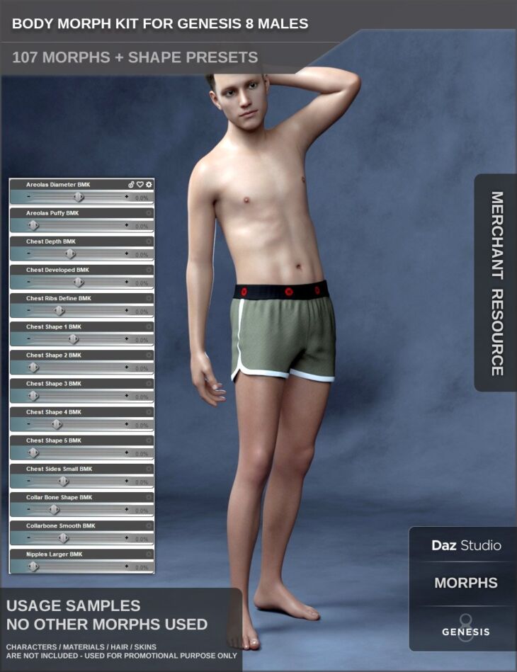 This body morph resource kit consists of 107 morphs to alter the body and it's parts of Genesis 8 Male based characters.