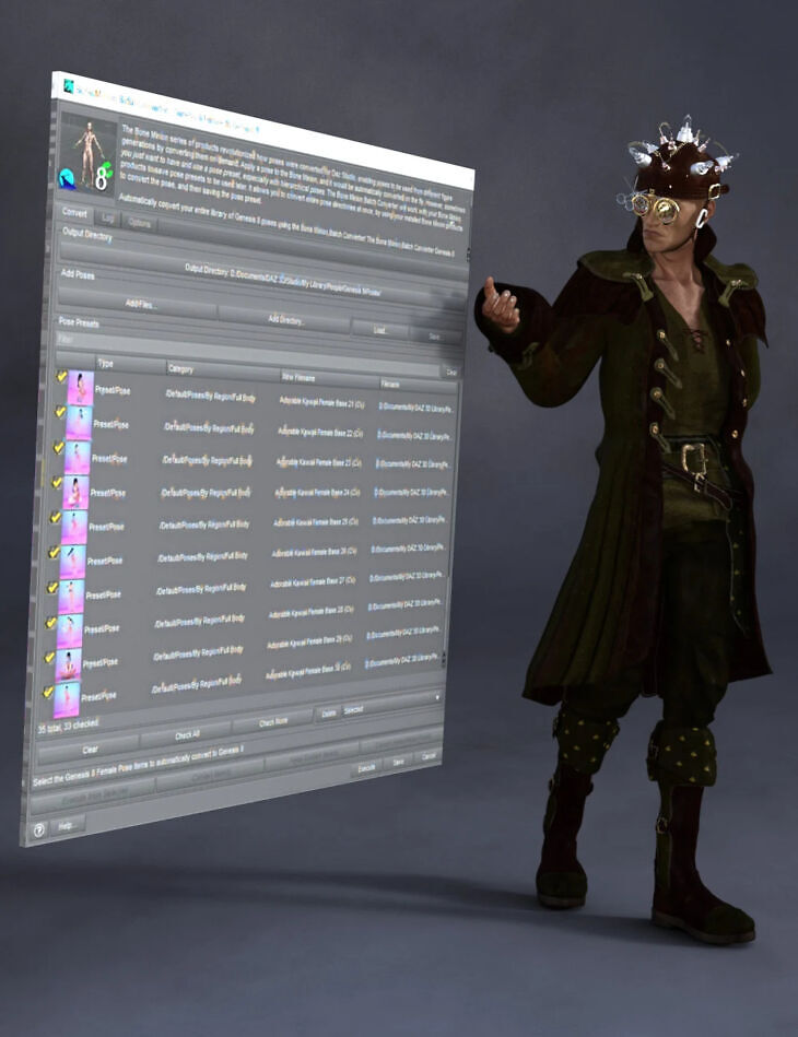 The Bone Minion Batch Converter will work with your bone minion products to save pose presets to be used later. It allows you to convert entire pose directories at once, by using your installed Bone Minion products to convert the pose, and then saving the pose preset.