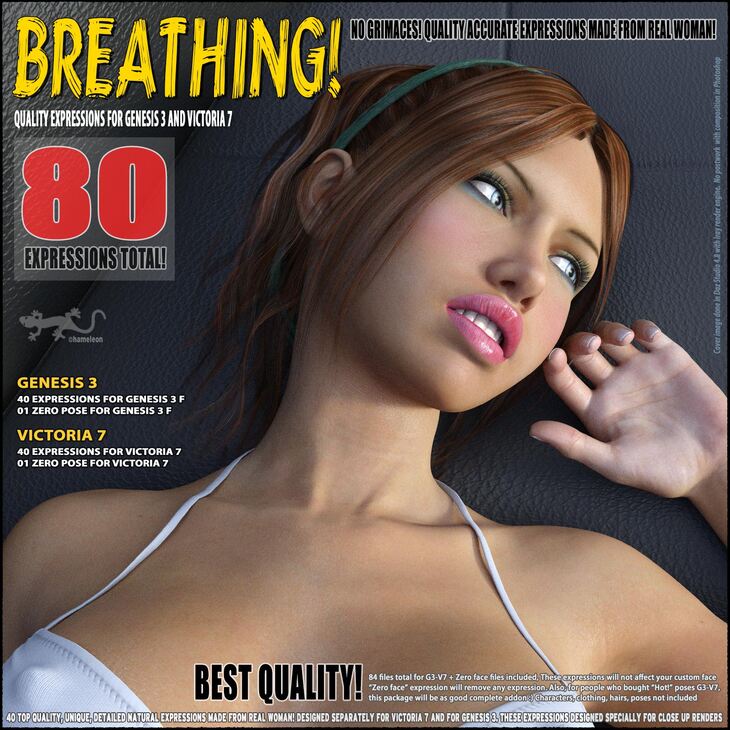 40 top quality, natural, detailed expressions made from real woman, designed separately for Genesis 3 Females and for Victoria 7.