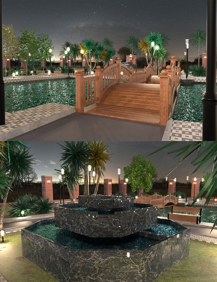 At the center lies a grand marble-tiered fountain, adding a touch of sophistication to the scene. Ambient lighting illuminates the gardens at night, creating a perfect atmosphere for romantic, fantasy, or architectural renders.