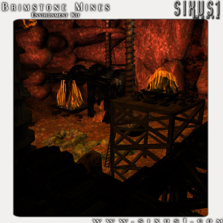 Includes: Figures: 1.)Mines with everything except the Machines as one OBJ and figure. 2.)The Machines with working corkscrew action Props: 1.) BareMines--this is the mine cavern and environmental capsule 2.) Ladder 3.) Pit&Flames (1-3) 4.) RockSmelter (with and w/o fire) 5.) Scaffolding Cameras Lights Textures Bonus P5 shaders,